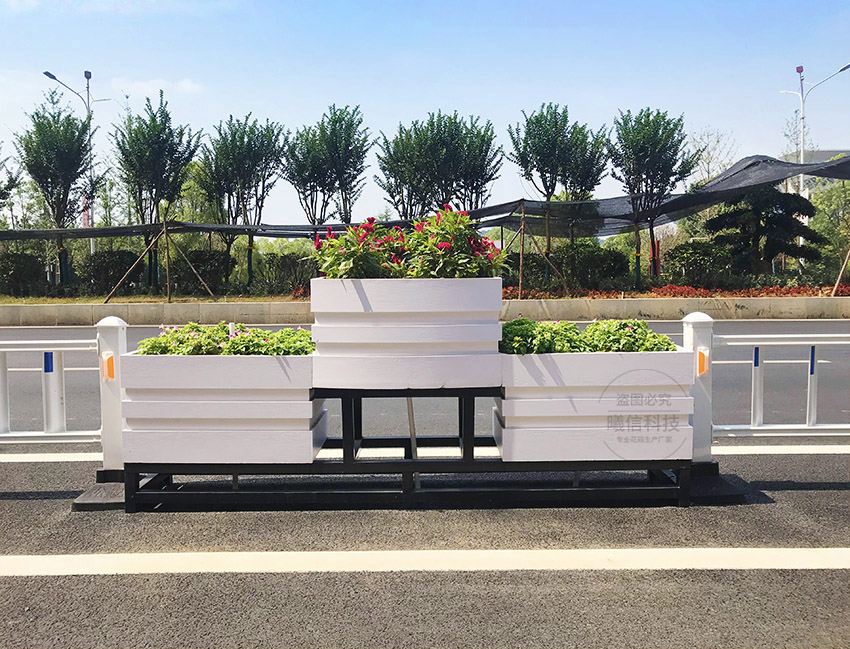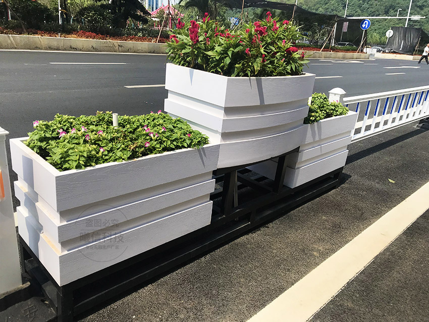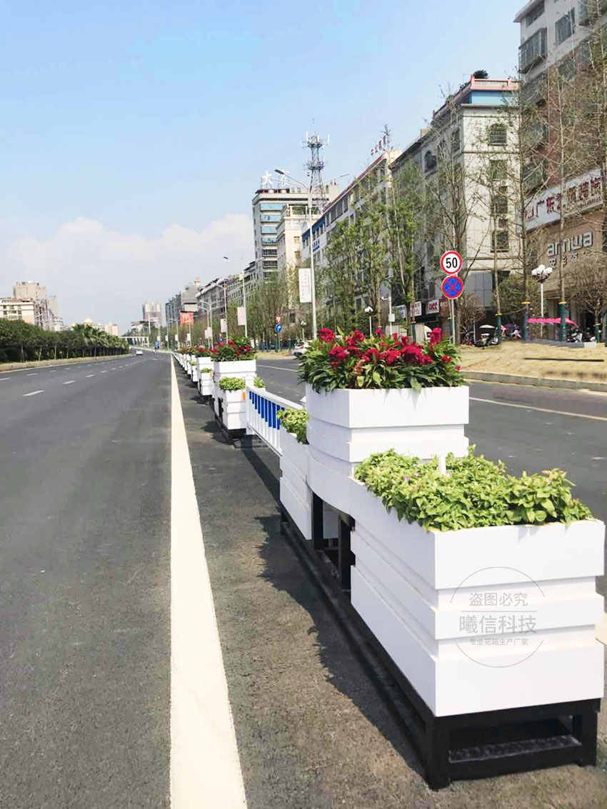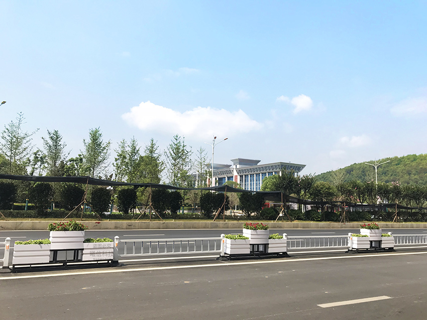 道路上的隔離花箱可選花箱護欄,花箱與護欄結合,滿足戶外市政使用需求:耐用、免維護、美觀。