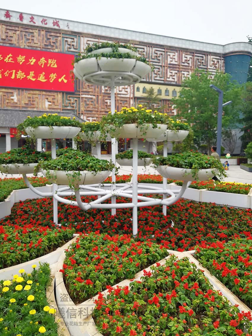 花箱也可以成為廣場公園綠化的主體。這款花箱擬花朵的形態(tài),組成了萬花叢,與花架一起成為了廣場的主體焦點。